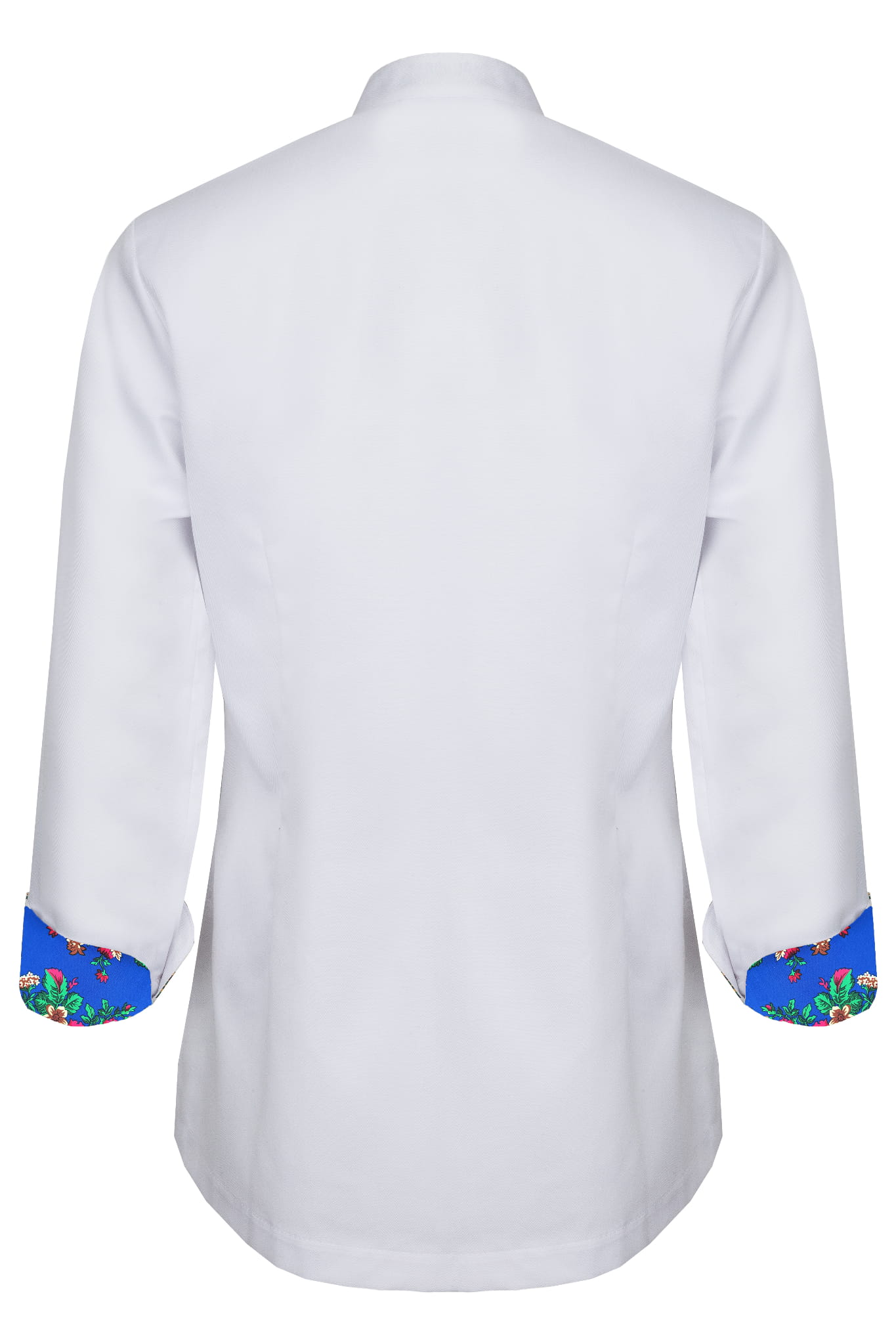 BLUZA KUCHARSKA komfort w kolorze białym z mankietami i stójką ze wzorem do wyboru. Taliowana, dzięki czemu dopasowuje się do figury. Zapinana na springi w kolorze niebieskim. Model – Tyche.
