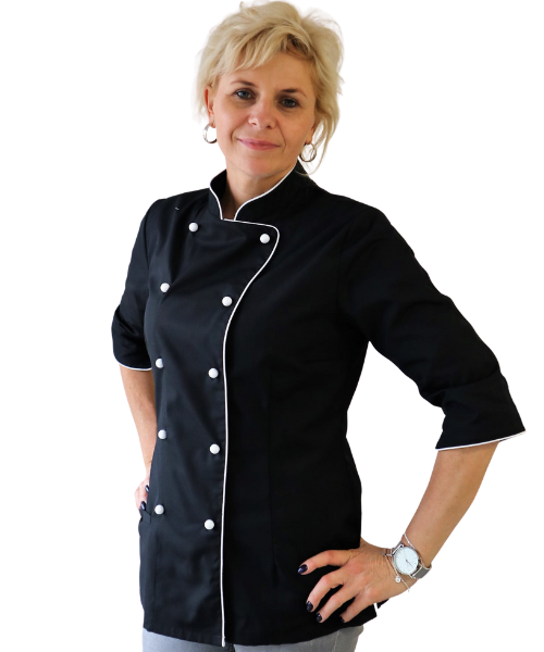 BLUZA KUCHARSKA komfort w kolorze szarym z mankietami i stójką wykończonymi ozdobną białą lamówką. Taliowana, dzięki czemu dopasowuje się do figury. Zapinana na guziki w kolorze białym. Model – Nike.