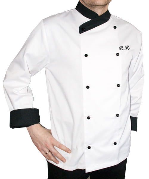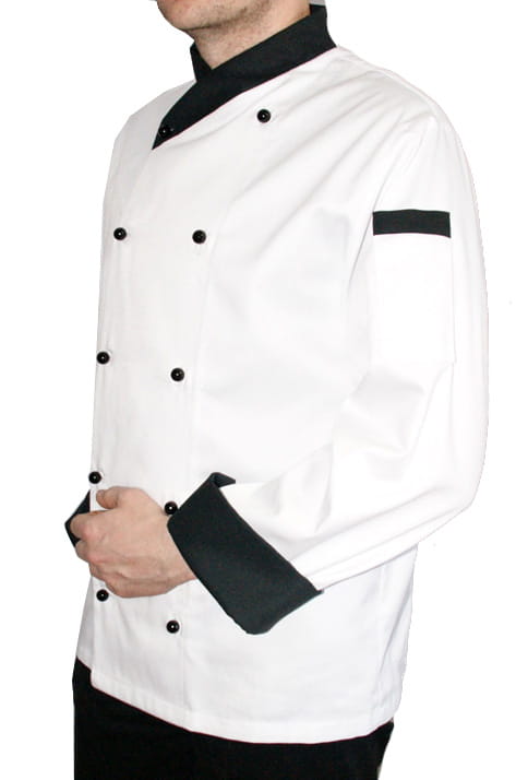 BLUZA KUCHARSKA kitel CHEF Producent biała z czarnym kołnierzem model Temida