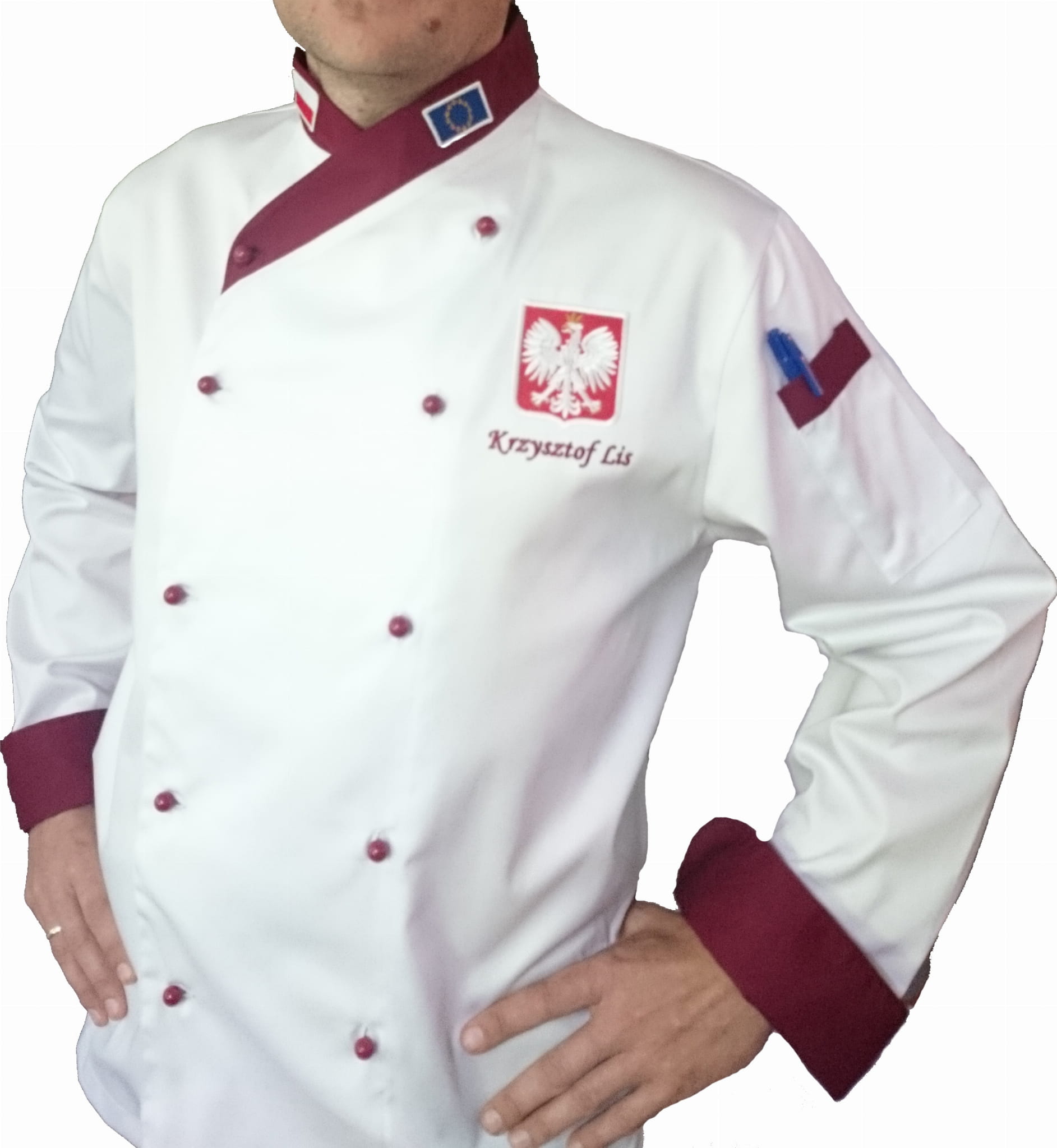 w kolorze białym, z mankietami, stójką i guzikami w czarnym kolorze oraz kieszonką na lewym rękawie.