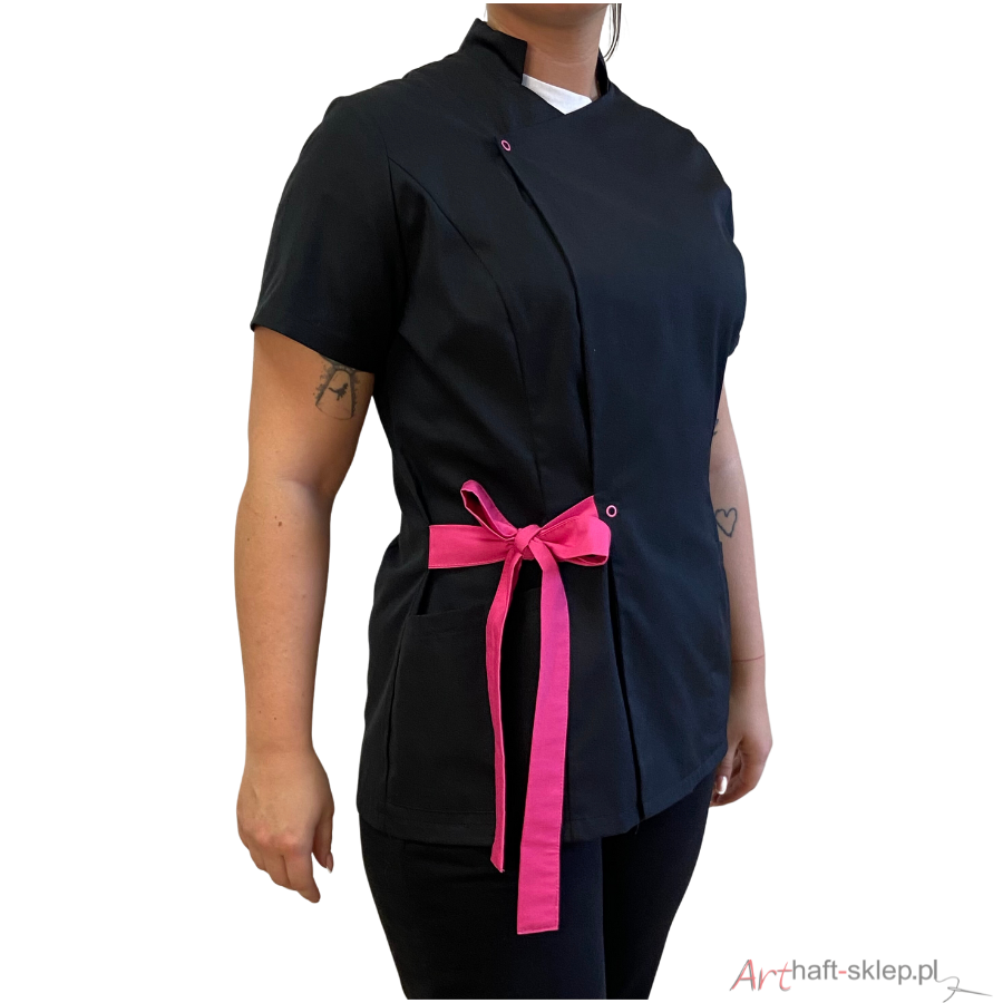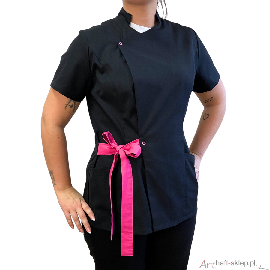 Nasz fartuch kosmetyczny ma także wyjątkowo dopasowany krój, który pięknie eksponuje kobiecą sylwetkę. Dzięki możliwości wiązania w pasie, fartuszek można dostosować do swoich preferencji i sylwetki, sprawiając, że każda figura będzie wyglądać w nim olśniewająco.