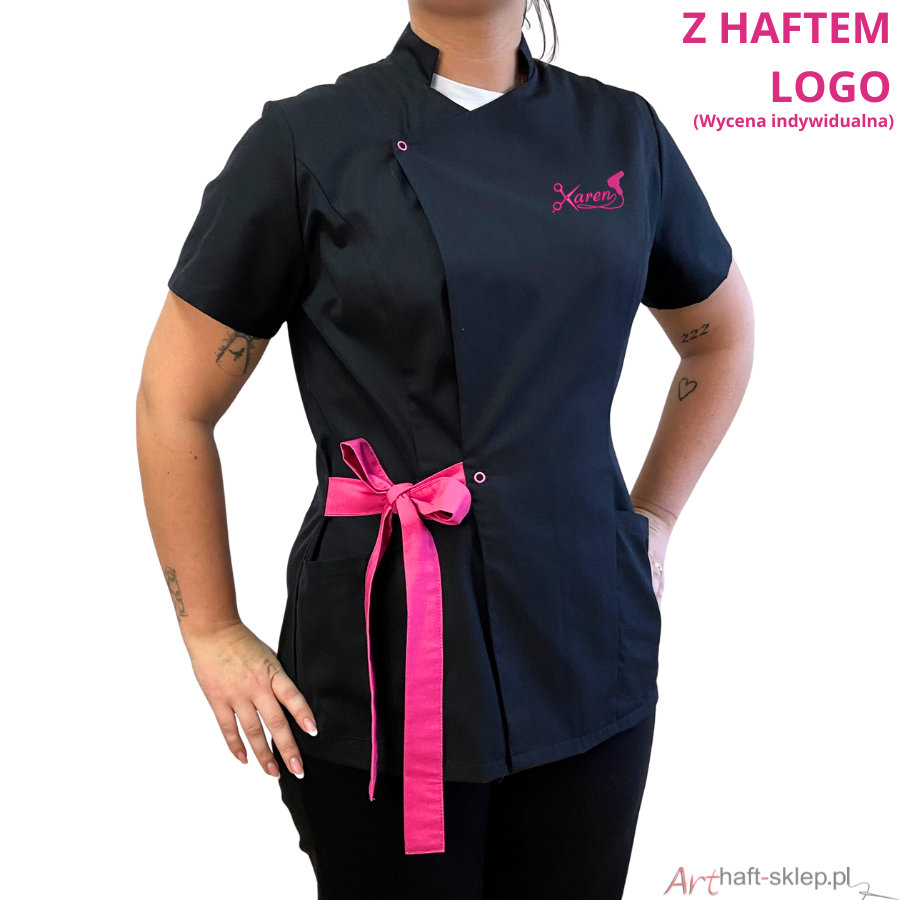 Nasz fartuch kosmetyczny ma także wyjątkowo dopasowany krój, który pięknie eksponuje kobiecą sylwetkę. Dzięki możliwości wiązania w pasie, fartuszek można dostosować do swoich preferencji i sylwetki, sprawiając, że każda figura będzie wyglądać w nim olśniewająco.